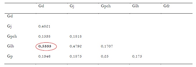 A 53,33 %, il existe un lien entre les groupements végétaux domestiqués (Gd) et (Glb)