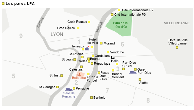 Emplacement des parcs de stationnements citadins dans Lyon (source : www. lpa.fr), qui sont d’ailleurs quasiment tous équipés de places dédiées V.E. avec bornes de recharge électrique, à l’initiative du directeur de LPA, François Gindre :
