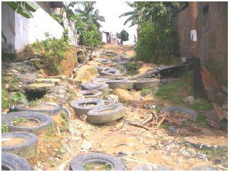 Photo 15 : Lutte anti-érosive par la stabilisation des pentes avec les pneus des voitures au quartier Carrière © OLINGA 07/2010