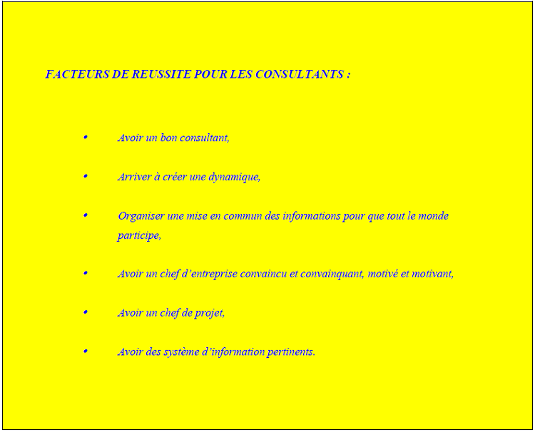 Les consultants apportent leur expérience et donne sa légitimité au projet. Ils savent être patient et faire respecter une méthodologie.