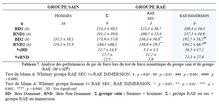 Il existe une différence entre le groupe RAE, le groupe RAE sec (test 2) et le groupe sain homme pour le BD et pas de différence pour le BND. On n’observe pas de différence entre le groupe immersion (test 2) et le groupe contrôle. Il y a néanmoins une différence significative entre les performances du groupe RAE sec et RAE immersion. Le groupe RAE sec possède des performances moins importantes, -31% pour le BD et -29% pour le BND. Cependant, si l’on compare les évolutions relatives, on ne constate pas de différence significative entre ces deux groupes.