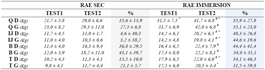 Au regard des résultats, on ne remarque pas de différence significative sur la progression du groupe de RAE au sec entre les tests 1 et 2. Une différence significative se retrouve lorsque l’on compare les tests 1 et 2 du groupe RAE immersion, sauf pour le TG. Néanmoins, les performances du test 2 sont plus importantes significativement pour le groupe RAE immersion, comparé au groupe RAE sec pour les muscles du MI.