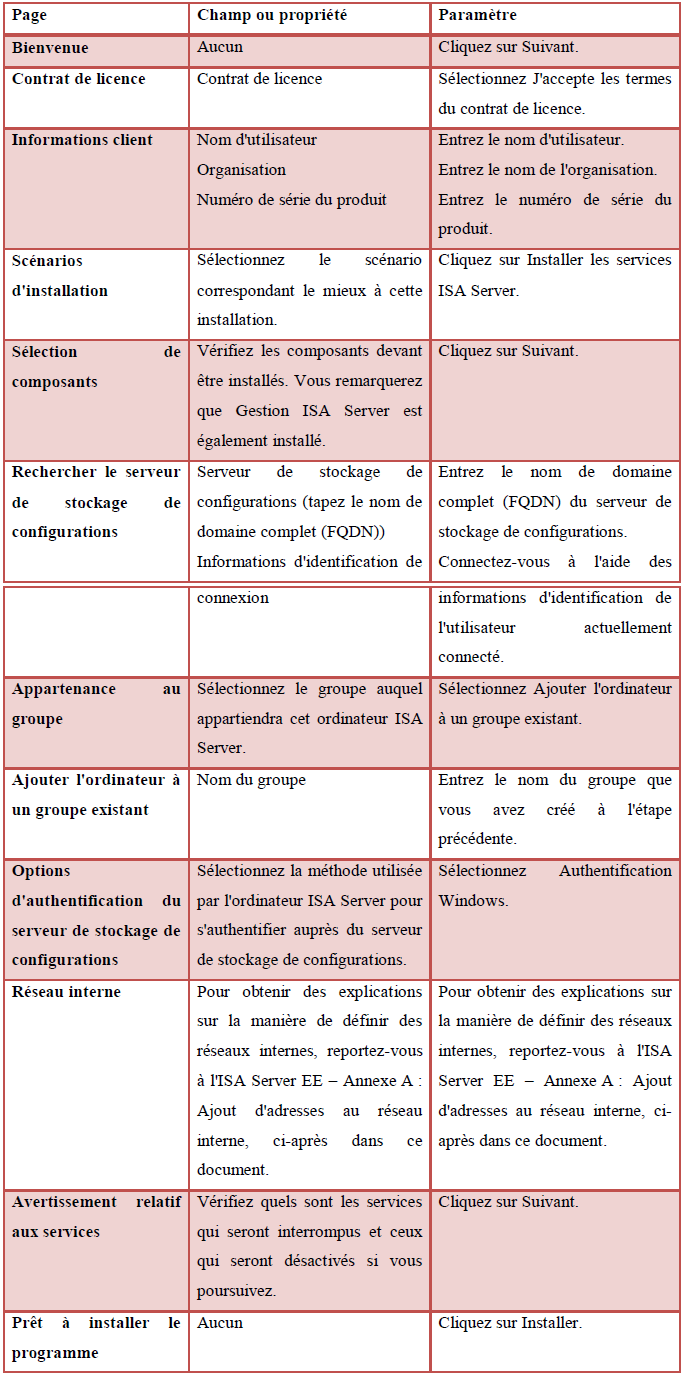 Pour installer un serveur dans le groupe, exécutez la procédure suivante. Pour installer un serveur dans le groupe Insérez le CD-ROM ISA Server dans le lecteur de CD-ROM ou exécutez ISAAutorun.exe à partir du lecteur réseau partagé. Dans Installation de ISA Server, cliquez sur Installer ISA Server 2006. Utilisez l’Assistant pour installer Microsoft ISA Server 2006 comme décrit dans le tableau suivant.