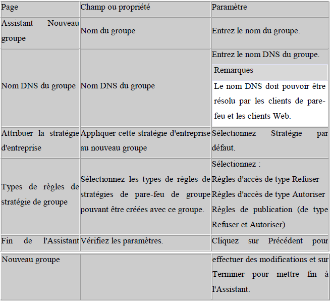 Un administrateur d’entreprise peut également créer des groupes et les peupler avec des serveurs en exécutant l’installation de l’ISA Server et en choisissant Créer un nouveau groupe sur la page Appartenance au groupe. L’administrateur d’entreprise a la possibilité d’interdire la création de certains types de règles par l’administrateur de groupe, uniquement après la création du groupe, mais ne peut en revanche pas interdire un type de règle si l’administrateur de groupe a déjà créé une règle de ce type.