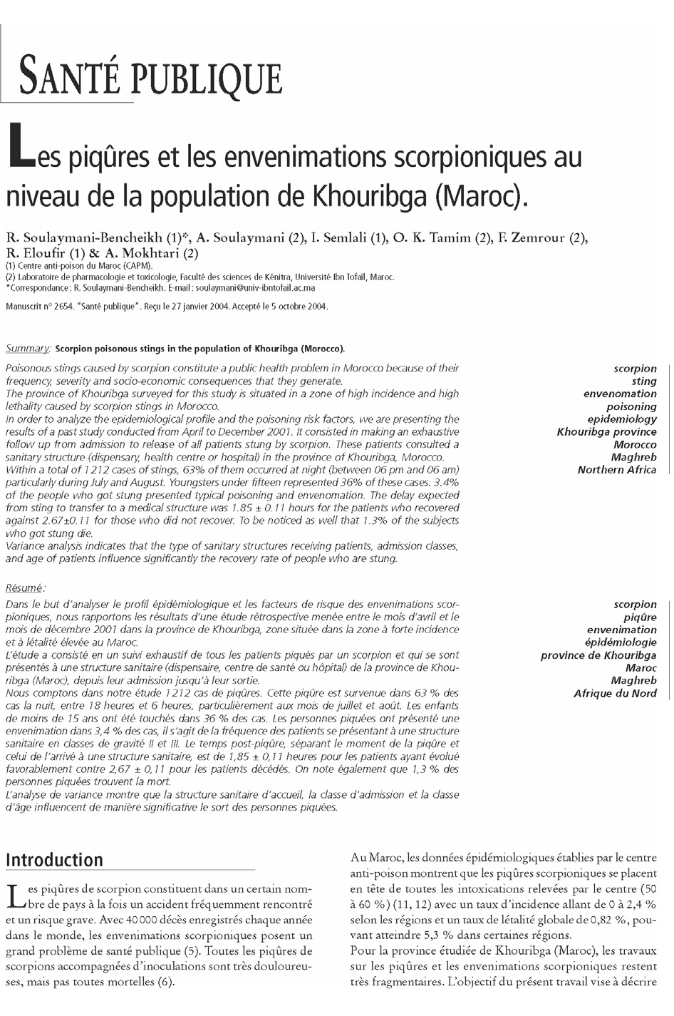 Retour au menu : Scorpionisme, Epidémiologie et Facteurs de Risque au Maroc : cas de la province de Khouribga