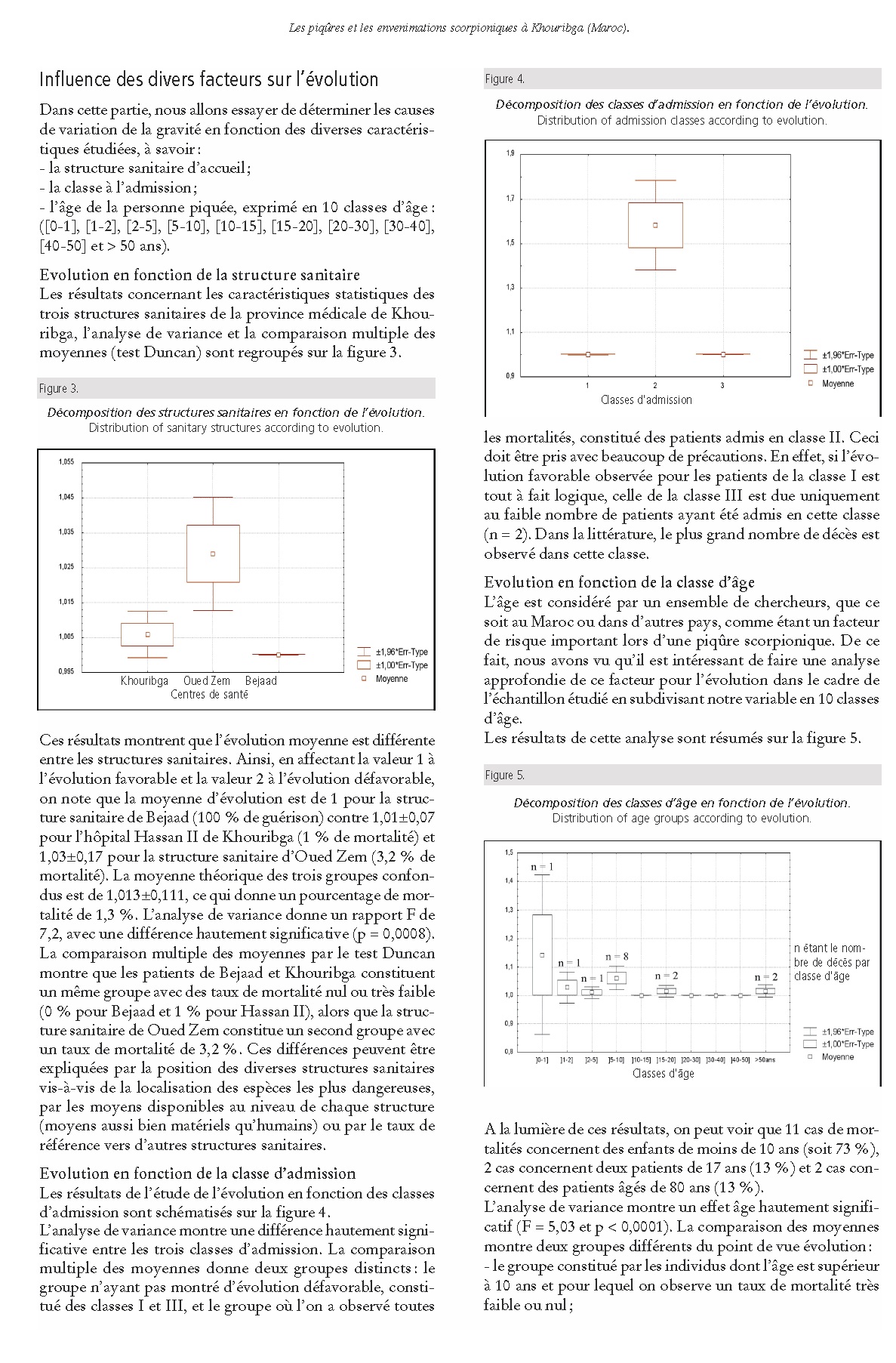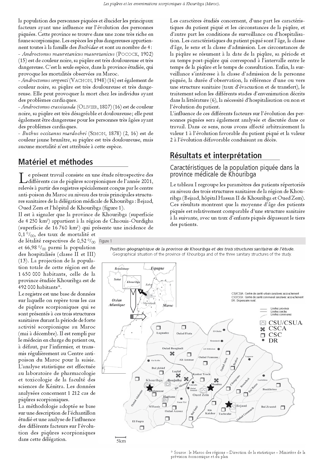 Les piqûres et les envenimations scorpioniques au niveau de la population de Khouribga (Maroc) admin 13 ans ago Bulletin de la Société de Pathologie Exotique, 98, 5, 36-40 Bull Soc Pathol Exot, 2005 Apr; 98(1), 36-40. Page suivante : Profil épidémiologique des piqûres et des envenimations scorpioniques au Maroc : Analyse du relevé mensuel (2001 à 2003)Retour au menu : Scorpionisme, Epidémiologie et Facteurs de Risque au Maroc : cas de la province de Khouribga