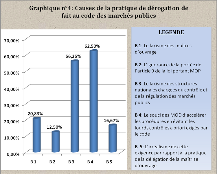 A l’analyse, le graphique n°4 révèle que, pour les personnes interrogées, la dérogation de fait au code des marchés publics par les MOD s’explique par le souci de ces derniers d’accélérer les procédures, en évitant les lourds contrôles a priori exigés par le code des marchés publics (62,50%) et, comme nous l’avions envisagé, par le laxisme des structures en charge du contrôle et de la régulation des marchés publics (56,25%). Les autres facteurs ont globalement été jugés moins pertinents, en l’occurrence, l’ignorance de la portée de l’article 9 de la loi MOP, que nous avions retenue en formulant notre hypothèse. Il se trouve, ainsi, que l’hypothèse spécifique n°2 n’est que partiellement vérifiée. L’élément de diagnostic qui en découle est le suivant : la pratique de dérogation de fait au code des marchés publics est due au souci des MOD d’accélérer les procédures, en évitant les lourds contrôles a priori exigés par le code, et au laxisme des structures nationales chargées du contrôle et de la régulation des marchés publics (Elément de diagnostic n°2).