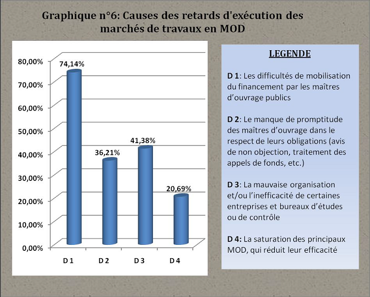 Nous présenterons, comme indiqué dans la méthodologie, les réponses aux questions visant à connaître les causes des problèmes spécifiques. Nous donnerons donc une illustration des résultats issus des enquêtes, analyserons les données et établirons le diagnostic relatif aux problèmes liés au cadre juridique de la MOD (1) et aux retards observés dans le processus de gestion des projets publics en MOD (2).