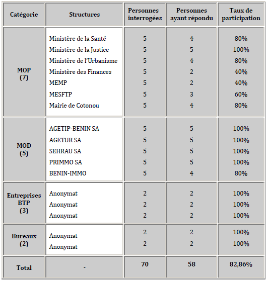 En raison de ces difficultés, la précision des données pourrait être quelque peu limitée, mais pas au point de faire douter de leur pertinence. Du reste, le taux de participation à l’enquête reste globalement satisfaisant, comme le montre le tableau ci-après :