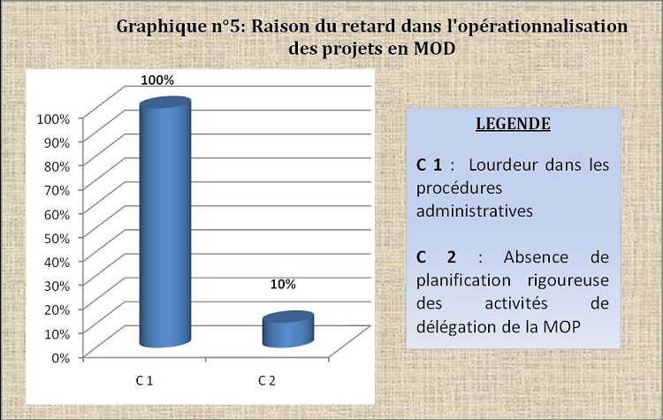 Le graphique n°5 illustre l’avis des personnes interrogées sur les facteurs qui expliquent le retard dans l’opérationnalisation des projets en MOD. La lourdeur dans les procédures administratives a été unanimement validée (100%), au détriment de l’absence de planification rigoureuse des activités de délégation, que nous avions pourtant retenue, en formulant l’hypothèse. L’hypothèse spécifique n°3 n’est donc pas vérifiée et l’élément de diagnostic est le suivant : la lourdeur dans les procédures administratives explique le retard dans l’opérationnalisation des projets et programmes en MOD (Elément de diagnostic n°3).