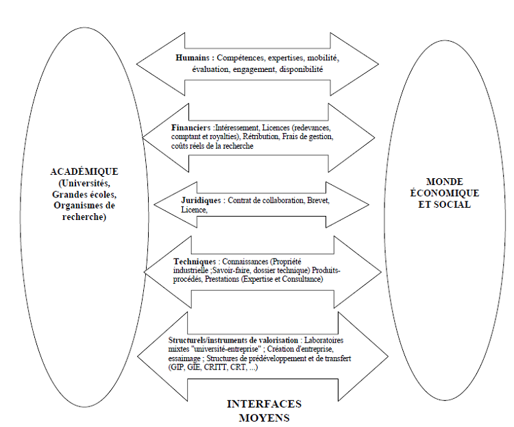 Du côté de la France, et selon un rapport du Comité National d’Evaluation de l’enseignement supérieur – CNE(15), la valorisation suppose : « des actions telles que la sous-traitance, la recherche et le développement en commun, le courtage et le transfert de technologie, la protection industrielle et intellectuelle, la veille technologique, l’information scientifique et technique, la consultance, l’expertise collective, le recrutement, l’aide à la création d’entreprise et la mise à disposition de chercheurs, l’assistance à l’innovation et son financement, et éventuellement le conseil juridique. La valorisation n’intègre pas de manière directe la diffusion des connaissances et la formation qui participent en amont à l’acquisition des compétences. » Elle établit une interaction qui met en valeur cinq types de moyens ou d’interfaces que la CNE schématise ainsi :