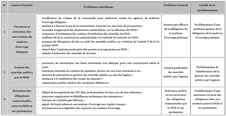 Ainsi inventoriés, ces problèmes doivent faire l’objet d’une synthèse, afin d’être mieux cernés : la qualité de notre recherche en dépend. Le premier problème, à savoir l’insuffisance du volume de la commande, pour intéresser toutes les agences, traduit sans doute la réticence des maîtres d’ouvrage publics à déléguer leurs prérogatives. Or, il ne peut être envisagé de contraindre ces entités à opter pour la délégation, car, étant les seules détentrices des prérogatives que leur confère la maîtrise d’ouvrage des travaux à réaliser pour leur compte, elles doivent posséder de façon absolue, la liberté de choisir ou non la délégation. A notre avis, ce problème sera certainement résolu, si l’on optimise la gestion des conventions de MOD, afin de faire de la délégation, un outil incontournable de mise en œuvre des projets publics. Aussi ne nous pencherons-nous que sur les autres problèmes de la liste.