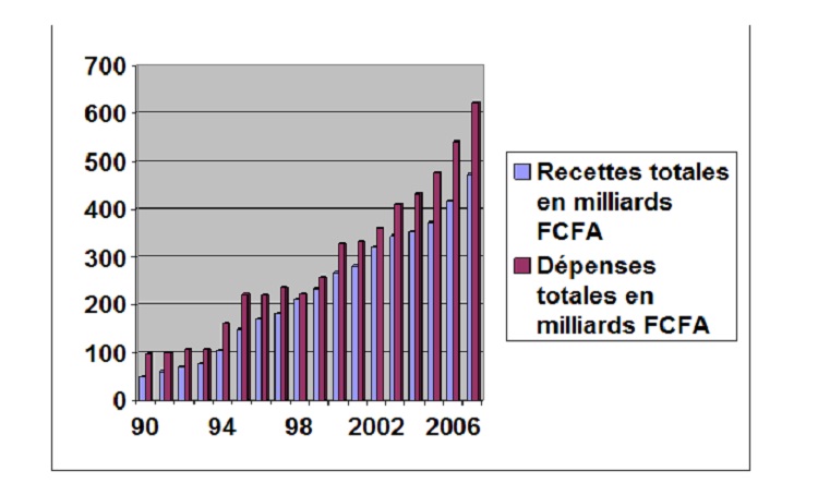 Les recettes publiques ont connu une évolution à la hausse de 1990 à 2007. Elles sont composées en majorité par les recettes fiscales. La réforme de l’administration fiscale et l’instauration de la TVA en 1991 ont énormément contribué à cette augmentation. D’un montant de 49,9milliards en 1990, les recettes publiques ont atteint 473,4 milliards en 2000. Ainsi elles ont été multipliées par 9,5 environ. Quant aux dépenses publiques, elles ont connu globalement un accroissement bien maîtrisé. En 2007, on enregistre environ 6,4 fois plus de dépenses qu’en 1990. En 1990, elles s’élevaient à 97,5 milliards de FCFA et en 2007 à 623,1 milliards. Tout le long de la période 1990-2000, l’augmentation de la part de la masse salariale a été contenue : 37% au début des années 90 et 26% à la fin de la décennie.