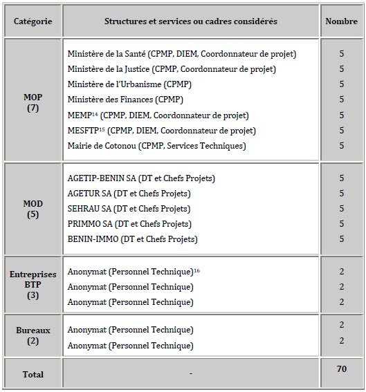 En ce qui concerne les agences de MOD, nous retiendrons d’office l’AGETIP-BENIN (ayant abrité notre stage), l’AGETUR et la SEHRAU, en raison de leur expérience dans le domaine. Deux autres agences seront choisies au hasard, ce qui portera à cinq (5), le nombre d’agences de MOD à retenir. Les cadres qui seront interrogés, dans ces agences, seront notamment les Directeurs Techniques et Chefs Projets, véritables acteurs de la gestion technique des agences (préparation et suivi des soumissions de l’agence, passation et suivi de l’exécution des marchés). Il eût été inapproprié de nous adresser prioritairement au personnel administratif, probablement moins enclin à donner des avis pertinents.