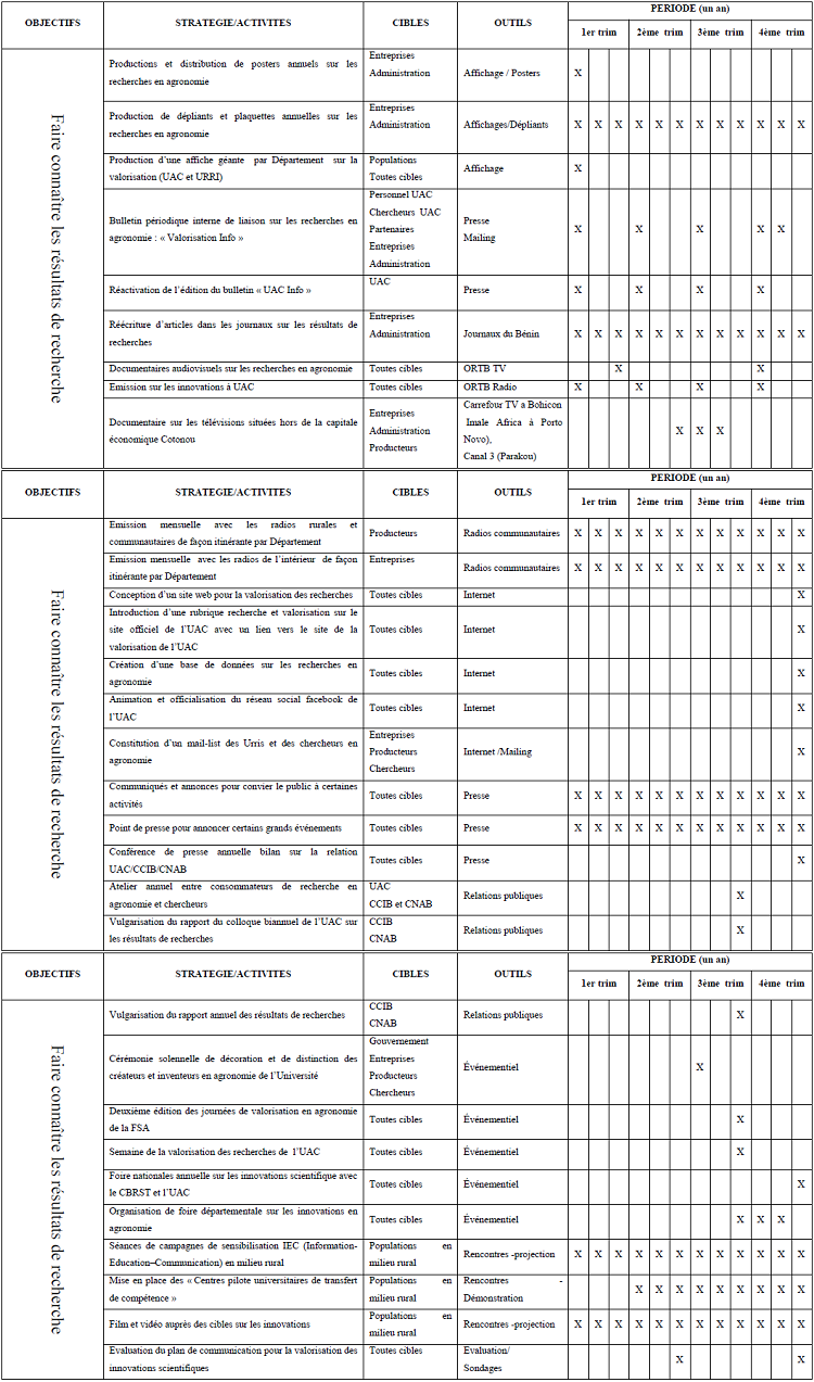 24 Cette Cellule à mettre en place pour appliquer cette stratégie de communication est différente de la Direction de la Valorisation de l’UAC à créer qui sera une structure administrative et technique de l’UAC.