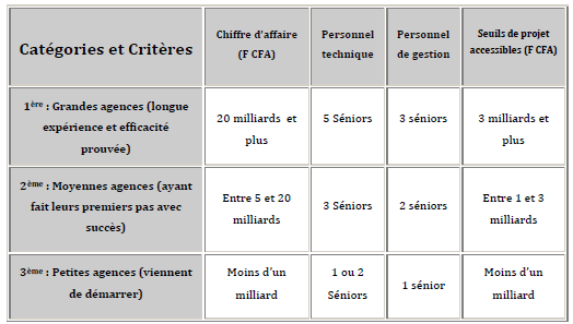 – de la catégorisation des agences : on ne peut comparer que des structures comparables. La différence qui existe entre les agences de MOD au Bénin est trop grande, en termes de capacités techniques notamment, pour que l’on puisse les comparer objectivement. Même en tenant compte de la qualité des ressources humaines pour les agences sans expérience, on ne comblera pas le gap. Il s’impose d’effectuer une catégorisation des agences, en fonction de critères objectifs (ancienneté, expériences, capacités techniques et financières, par exemple) et dans des conditions transparentes. Ainsi, les agences d’un même calibre pourront être mises en concurrence, selon des seuils déterminés. Le tableau suivant est proposé, à titre d’illustration seulement.