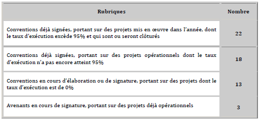 A la lecture du tableau, on se rend compte qu’en dehors des projets clôturés ou qui sont sur le point de l’être (lesquels ont démarré, pour la plupart, avant l’année 2010), un nombre important de projets sont encore non opérationnels. Cette situation est préjudiciable, non seulement pour l’agence, mais aussi pour le maître d’ouvrage. En effet, du côté du maître d’ouvrage, le temps nécessaire à l’élaboration du programme de l’opération et à la détermination de son enveloppe financière, auquel s’ajoute le processus de sélection du MOD et la lente phase d’élaboration et de signature de la convention font que le projet ou programme ne devient opérationnel que vers la fin de l’année budgétaire pour le compte de laquelle il est inscrit : ce qui explique, en partie, les problèmes de financement des opérations. Quant à l’agence, pour éviter les conséquences d’un démarrage tardif du projet, elle est parfois amenée à préfinancer l’opération, contrevenant ainsi à deux principes fondamentaux, à savoir d’une part l’obligation de financement de l’opération incombant au maître d’ouvrage (et interdisant que le MOD soit amené à assurer le financement, même s’il compte récupérer les sommes investies) et d’autre part l’interdiction de la signature d’un marché public à titre de régularisation (la convention n’étant pas signée, le MOD n’est juridiquement pas fondé à poser des actes dans le cadre d’un mandat inexistant). On notera donc comme difficulté le retard dans l’opérationnalisation des projets et programmes en maîtrise d’ouvrage déléguée.