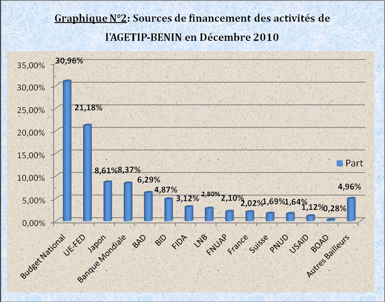 – la part de financement du Budget National a plutôt progressé (26% à 30,96%), preuve que les maîtres d’ouvrage publics font de plus en plus recours à la délégation directe, c’est-à-dire sans interférence des bailleurs de fonds.