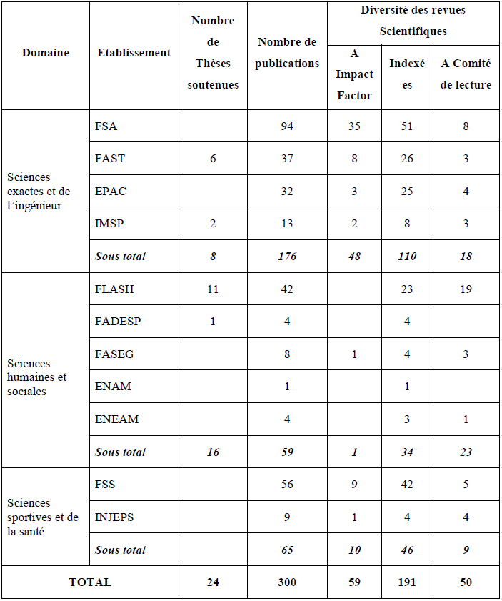 Tableau III : Nombre de thèses soutenues à l’UAC, nombres de publication et diversité des revues scientifiques en 2009 (les données sont à relativiser pour certains établissements)