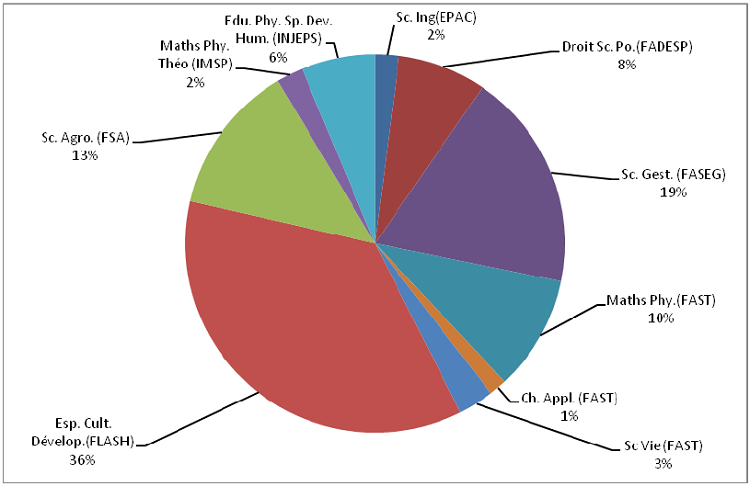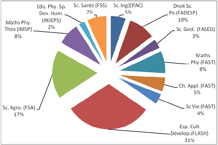 Les figures suivantes tirées du rapport d’activité de la recherche universitaire d’Abomey-Calavi en 2009 montrent la part des recherches agronomiques effectuées par la FSA dans l’ensemble des recherches effectuées à l’Université d’Abomey–Calavi.