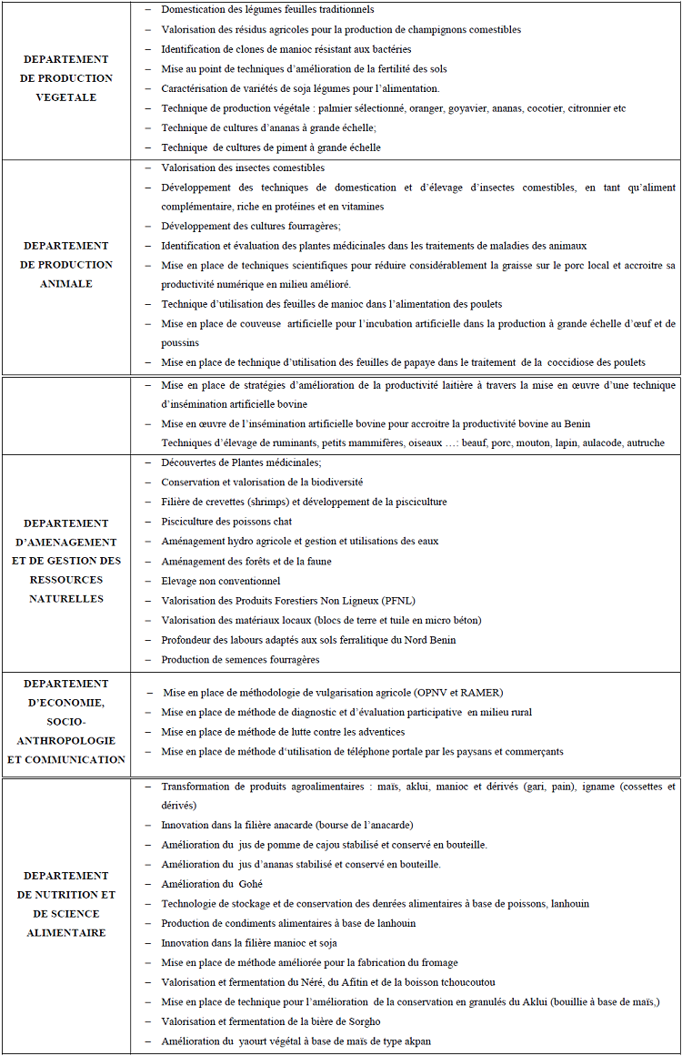 En ce qui concerne les productions et innovations scientifiques à l’Université d’Abomey-Calavi dans le domaine agronomique proprement dit, elles se mènent au sein des laboratoires et ateliers scientifiques logés dans les cinq départements de formation et de recherche de la Faculté des Sciences Agronomiques. Ces recherches se mènent par les enseignants –chercheurs et les étudiants et sont diffusées à travers les publications scientifiques, les mémoires de maîtrise, les thèses de doctorat, les mémoires de master professionnel ou de recherche, les monographies villageoises, les mémoires de licence etc.
