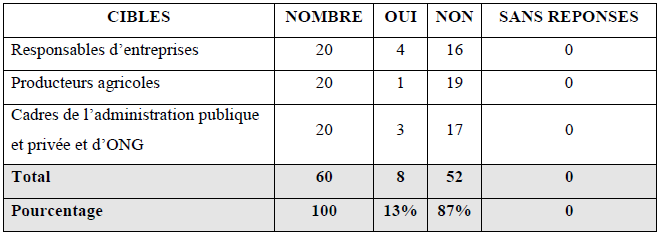Avant de présenter les résultats, il convient de signaler que les cent (100) questionnaires distribués ont été intégralement récupérés et ont pu être exploités, soit un taux de 100 % de l’échantillon.