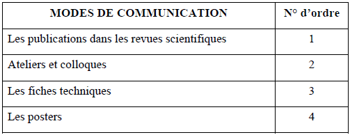 Le tableau sur les modes de communication des enseignants-chercheurs a révélé que le moyen media le plus utilisé est la publication scientifique, suivi des ateliers et colloques scientifiques.