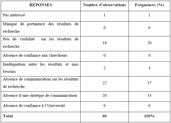 En ce qui concerne la question «Quelles sont les raisons pour lesquelles vous n’êtes pas informés des résultats de recherche à l’Université ? », les résultats se présentent comme suit :