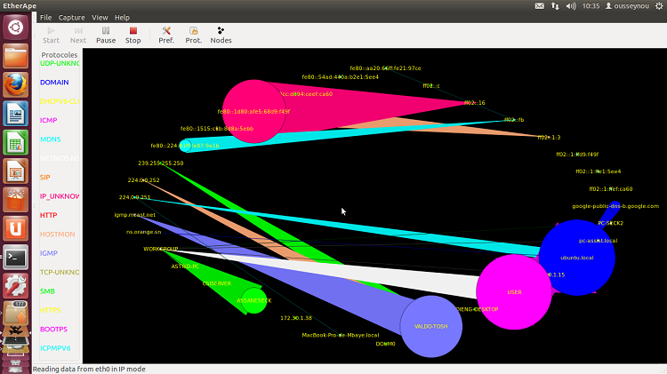 L’utilisateur peut obtenir des informations supplémentaires sur le transfert (port, origine et destination, taille, date…) s’il clique sur le trait marquant. On peut configurer EtherApe afin de ne visualiser qu’une partie du trafic (par exemple le trafic vers internet seul).
