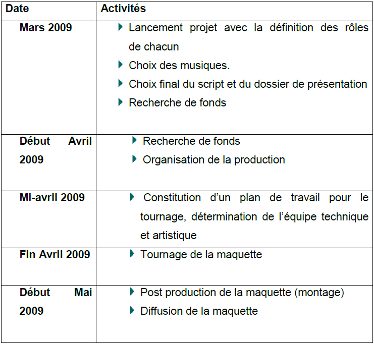 Aussi, ce projet sera également l‟occasion de se faire connaitre et ébaucher auprès des partenaires techniques et financiers intervenant dans le domaine, comme dans le monde de l‟audiovisuel.