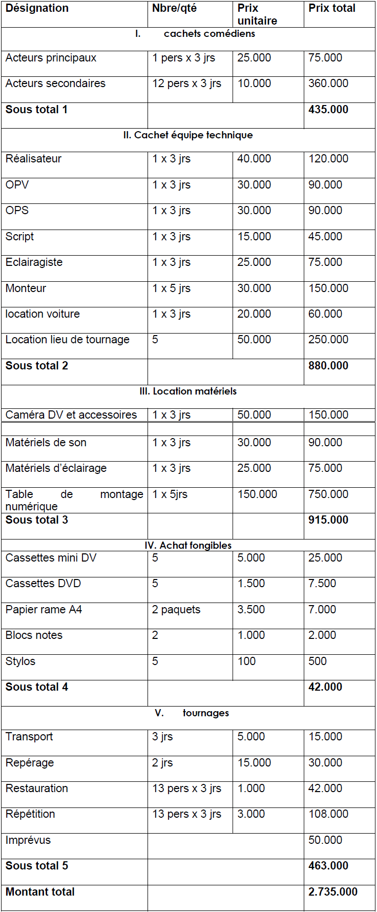 Cette somme sera allouée à la location du matériel, et lieu de tournage, au paiement des indemnités des techniciens et des acteurs.