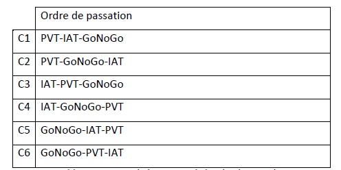 Ainsi chaque groupe a été réparti en 6 conditions, chaque condition correspondant à l’ordre dans lequel les sujets passent les tâches (tableau 1).