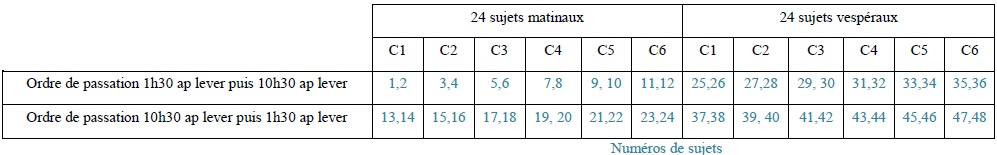 Chaque sujet a été testé à 2 reprises : une fois au moment non-optimal (10h30 après le réveil pour les matinaux, 1h30 après le réveil pour les vespéraux), une fois au moment optimal (1h30 après le réveil pour les matinaux, 10h30 après le réveil pour les vespéraux).