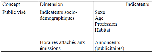 Nous le déterminons par des indicateurs sociodémographiques, suivants : le sexe, l’âge, la profession, habitat. Aussi par les horaires attachés à telles émissions pour intéresser les annonceurs.