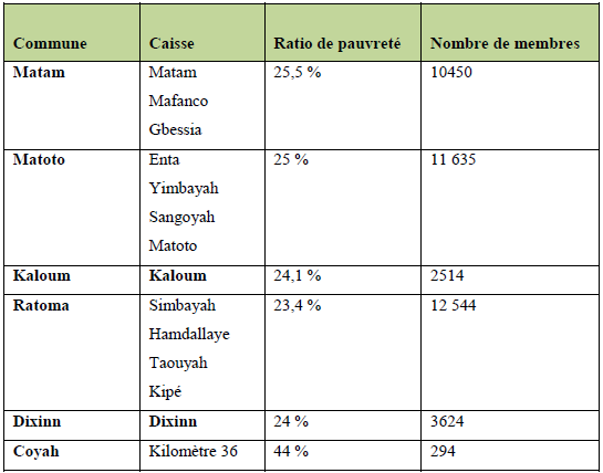 Le Reseau compte 14 caisses, dont 13reparties dans les cinq communes de Conakry et une au Kilometre 36, accusant toutes des taux eleves de pauvrete.Au 31 decembre 2009, les 14 caisses comptaient41 061 membres et 55 employes.