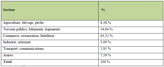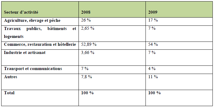Tous les secteurs de l’économie nationale ont bénéficié des financements avec une nette prédominance des financements du secteur du commerce, de la restauration et de l’hôtellerie (54 % des financements en 2009).
