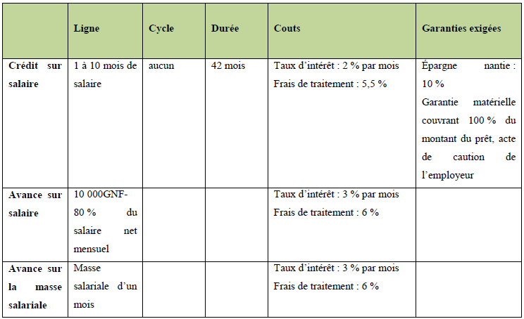 Les produits de crédits non productifs offerts par les caisses du réseau sont : crédit sur salaire, avance sur salaire, avance sur masse salariale.