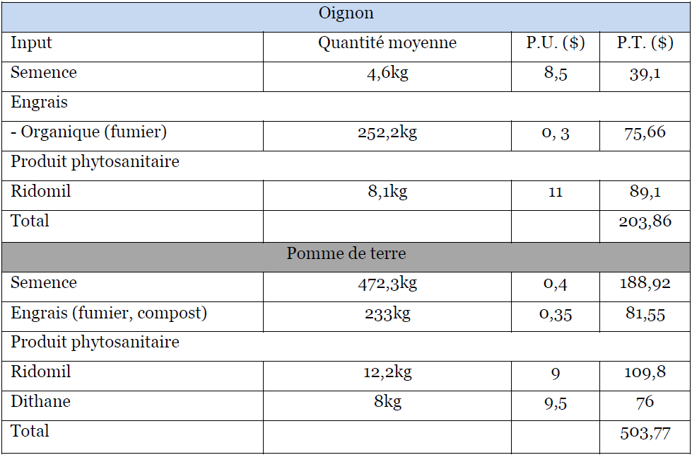 Le tableau ci-dessous présente les dépenses en intrants (input) utilisées pour la culture de l’oignon et de la pomme de terre et la comparaison des coûts liés à l’acquisition d’intrants pour la production de l’oignon et de la pomme de terre sur une superficie de 1ha.