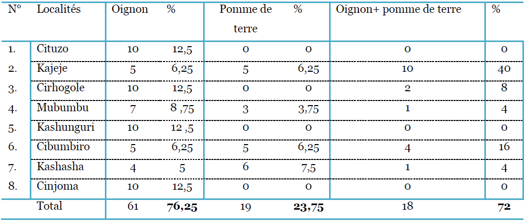 Les données du tableau ci – haut indiquent la spéculation qui prédomine dans l’aire d’étude, font constater que l’oignon est la culture la plus pratiquée par rapport à la pomme de terre suite à son faible cout d’intrants nécessaires pour la production. En effet l’acquisition de la semence de la pomme de terre coute plus cher que celle de l’oignon ; il en est de même pour ce qui est des produits phytosanitaires ( voir tableau 9 : cout d’acquisition des intrants pour la pomme de terre et oignon).En ce qui concerne la répartition des cultures dans les localités, les résultats du tableau 4 montrent que les agriculteurs qui font à la fois la pomme de terre et l’oignon sont plus nombreux dans la localité de Kajeje (40% des enquetés),suivis de ceux de Cibumbiro, avec 16%.