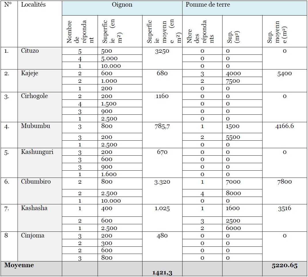Les tableaux 2 et 3 renseignent sur la superficie moyenne qu’occupent l’oignon et la pomme de terre à Mudaka et leur répartition dans les différentes localités