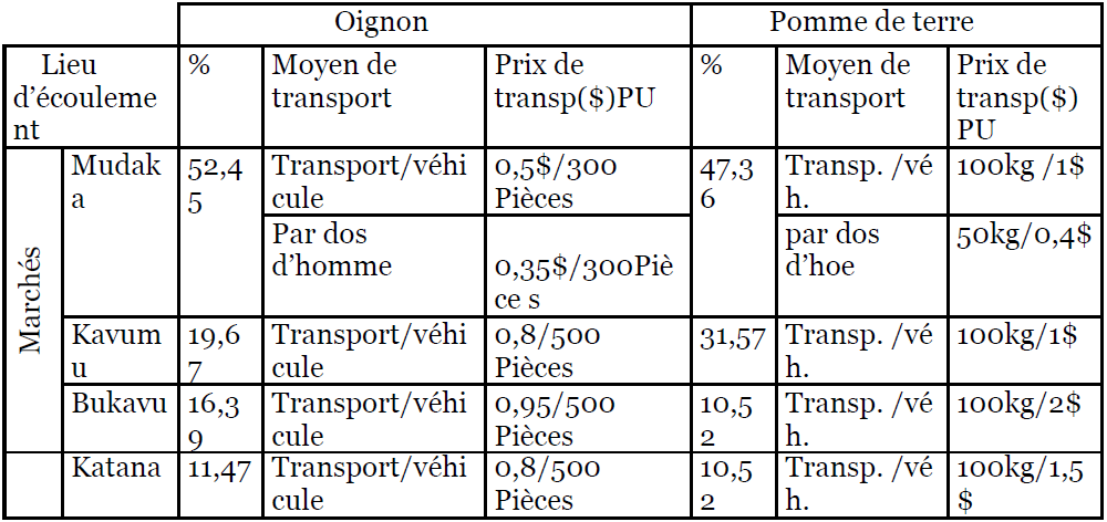 Il se dégage des résultats du tableau 8 que la plupart des producteurs amènent au marché leurs productions, à part quelques producteurs qui vendent leur production directement aux champs pour échapper au coût de transport. Les principaux marchés d’écoulement de l’oignon et de la pomme de terre sont :Mudaka, Kavumu, Bukavu et Katana.