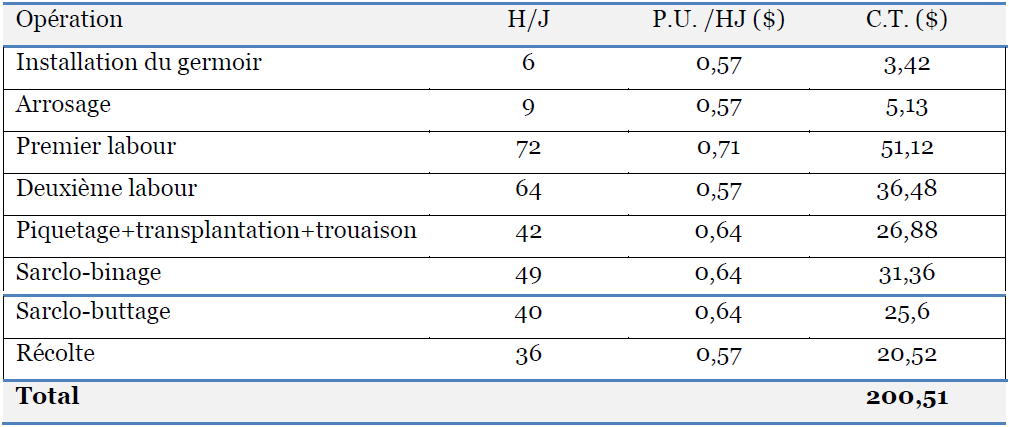 Les résultats du tableau 5 montrent que le coût total de la main d’oeuvre liée aux opérations culturales pour emblaver 1ha de pomme de terre est en moyenne de 202,45$ et sont presque égaux à ceux de l’oignon. En ce qui concerne les labours et les sarclobuttages, les résultats de la pomme de terre sont similaires à ceux de l’oignon. En effet, chez la pomme de terre comme chez l’oignon, les labours et les sarclobuttages sont les opérations culturales qui nécessitent assez d’investissement de 51,12 et 35,84$.En suite viennent les opérations comme la récolte et le calibrage, le piquetage et la plantation ainsi que le hersage dont les dépenses nécessaires sont comprises entre 11 et 17$,tandis que les autres opérations exigent moins de 10$ par hectare.