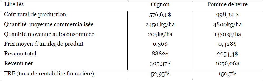 La comparaison des taux de rentabilité financière obtenus des deux cultures (oignon et pomme de terre) a montré que le taux de rentabilité financière de la pomme de terre est de loin élevé par rapport à celui de l’oignon, soit environ le double. Il en est de même pour ce qui du revenu total et du revenu net engendré par la pomme de terre, bien que sa production nécessite assez de moyens par rapport à l’oignon. La pomme de terre a donné un taux de rentabilité élevé de 105,78%, supérieur à 100%, ce taux de rentabilité est sécurisant car selon IFDC (2009) un taux de rentabilité supérieur à 100% est meilleur et sécurisant pour les petits producteurs.