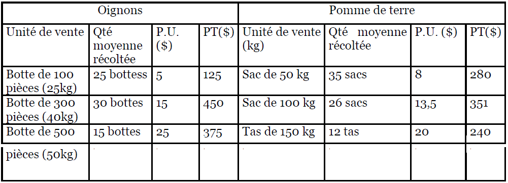 Les prix sont variables selon le calibre ou la grosseur des bulbes de l’oignon et des tubercules de pomme de terre. Il en est de même lors de l’emballage où on vient de constater au tableau 7 que les bottes sont classées selon l’importance de la grosseur des bulbes de l’oignon et les sacs selon le calibre des tubercules de pomme de terre.