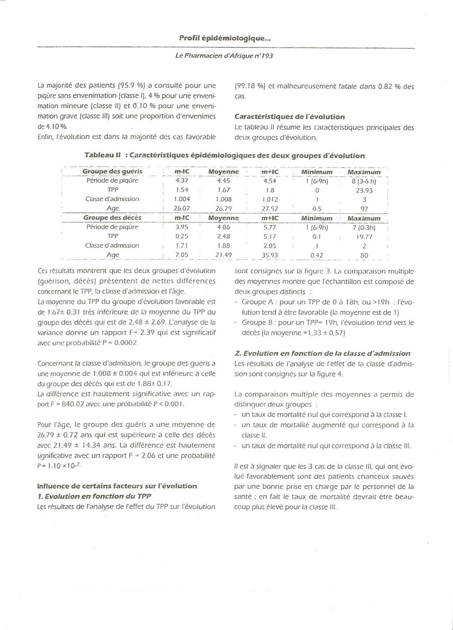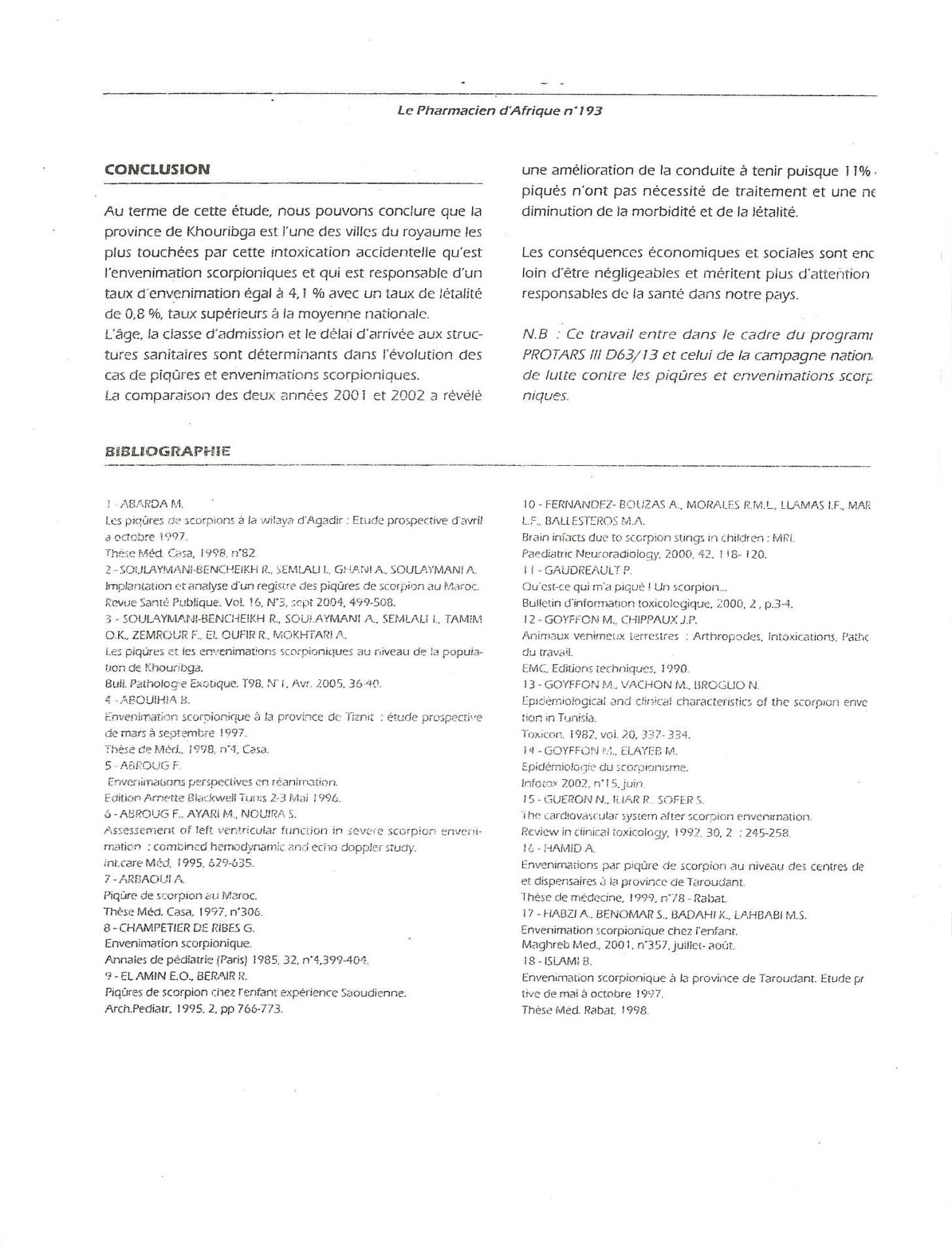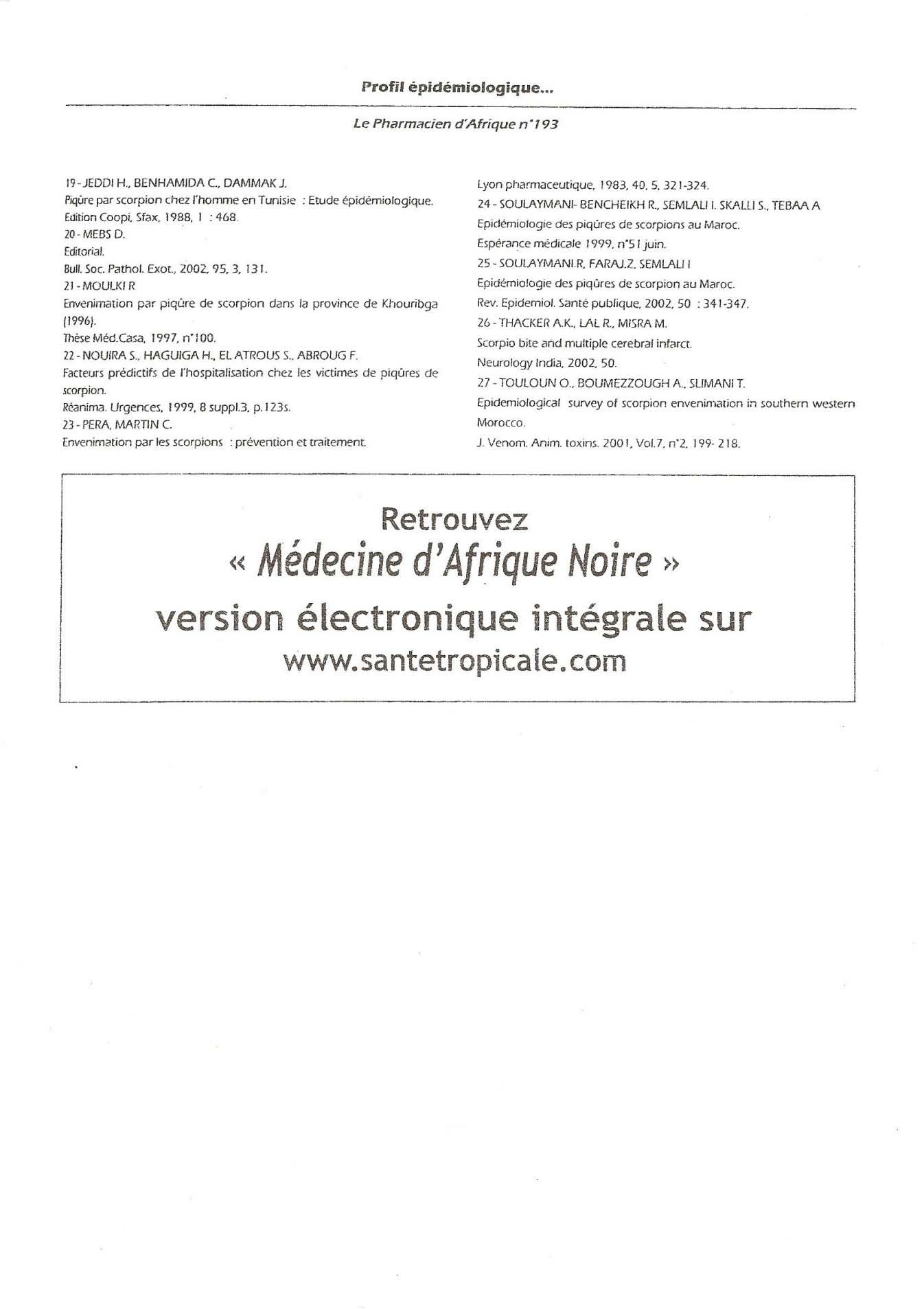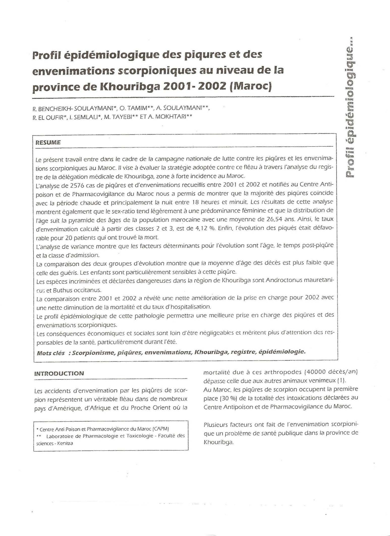 Profil épidémiologique des piqûres et des envenimations scorpioniques au niveau de la province de Khouribga 2001- 2002 (Maroc) admin 13 ans ago Le pharmacien d’Afrique. 2006 juin /juillet ; 193 :17- 27. Page suivante : Scorpion stings in one province of Morocco: Epidemiological, clinical and prognosis aspectsRetour au menu : Scorpionisme, Epidémiologie et Facteurs de Risque au Maroc : cas de la province de Khouribga