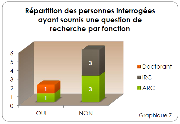 Parmi les personnes interrogées, deux ont pu soumettre une question de recherche. Comme la question précédente, il s’agit des deux personnes qui ont été amenées à le faire dans le cadre d’un Master Recherche ou d’un Doctorat. Néanmoins, elles sont satisfaites d’avoir pu le faire, pour la « démarche intellectuelle » que cela leur a amené à avoir, et pour la contribution aux savoirs infirmiers.