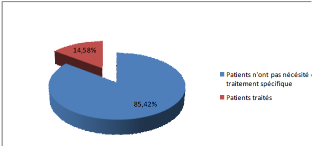 Dans notre série d’étude 58462 cas n’ont pas nécessité de traitement, T0=52,44%, contre 16254 cas qui ont bénéficié d’un traitement spécifique, T1=14,58.alors que 36767 cas ont bénéficié d’un traitement par mesure de précaution, car ils ont eu recours à la médecine traditionnelle (scarification, sussion, etc), T2 = 32,98, donc on peut les inclure avec les patients qui n’ont pas nécessité un traitement spécifique. Donc T1=85,42% et T2=14,58%.