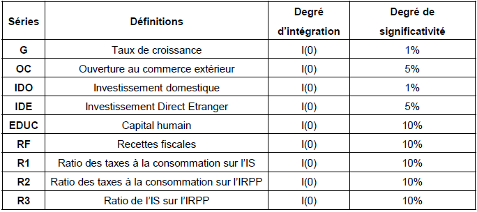 Les variables sont toutes stationnaires en niveau au seuil de 1% à 10%