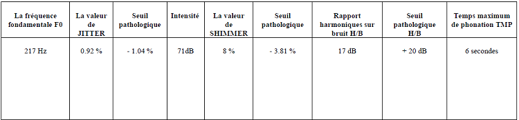 résultats de l’analyse acoustique de la voix du deuxième cas (O.A), après l’application du protocole thérapeutique