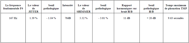 résultats de l’analyse acoustique de la voix du premier cas (B.D), avant l’application du protocole thérapeutique